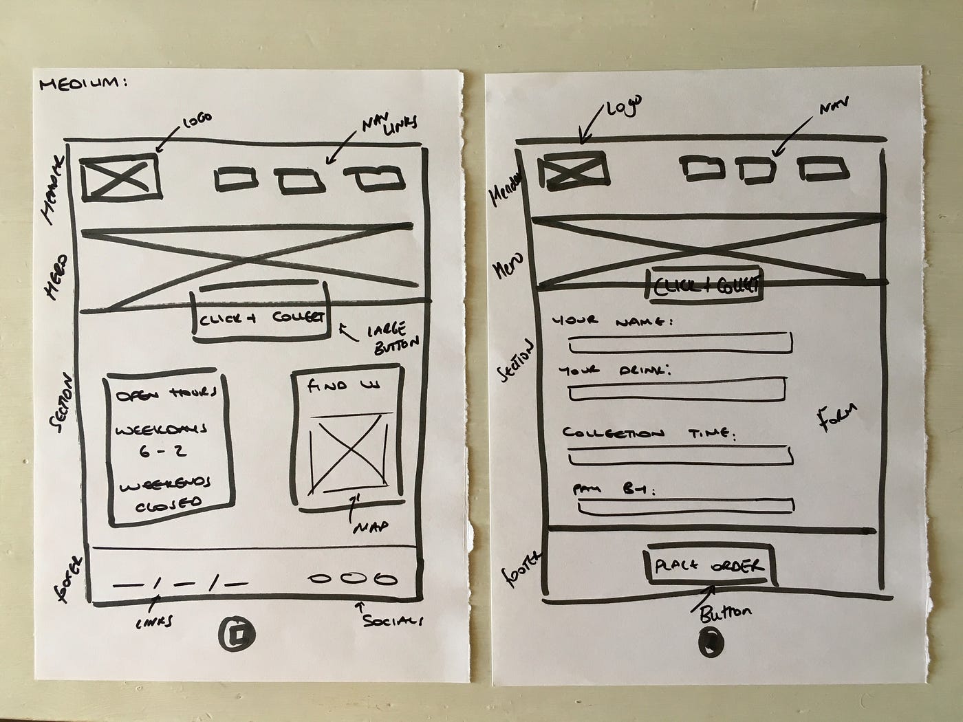 Next I moved onto wireframing for medium screens. The landing page layout doesn't differ from large screens but the click and collect form field inputs are now on top of each other. Again the click and collect button is central to the page with open hours and location information prime position.