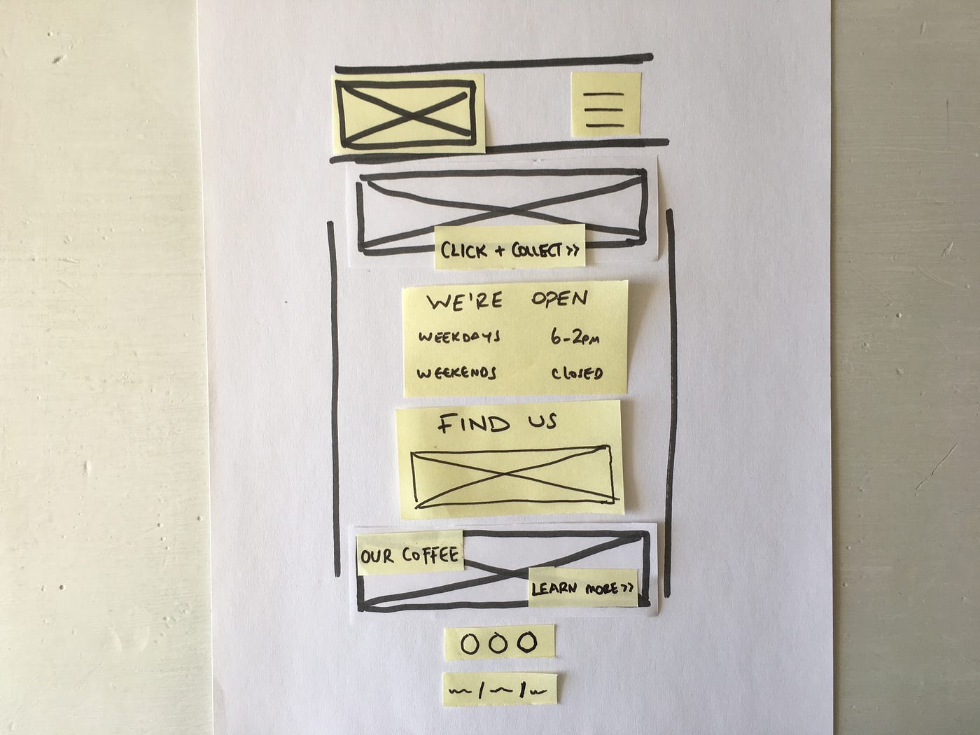 When thinking about layout, I wanted the click and collect button to be nice and big and take prime position on the page. The client really wants focus on the click and collect feature and to make sure that her customers know where to go, so this is a way of achieving that. Open hours and location was also important to the client, so I've placed these just below the click and collect button on the landing page, so that this information is nice and clear to the user.