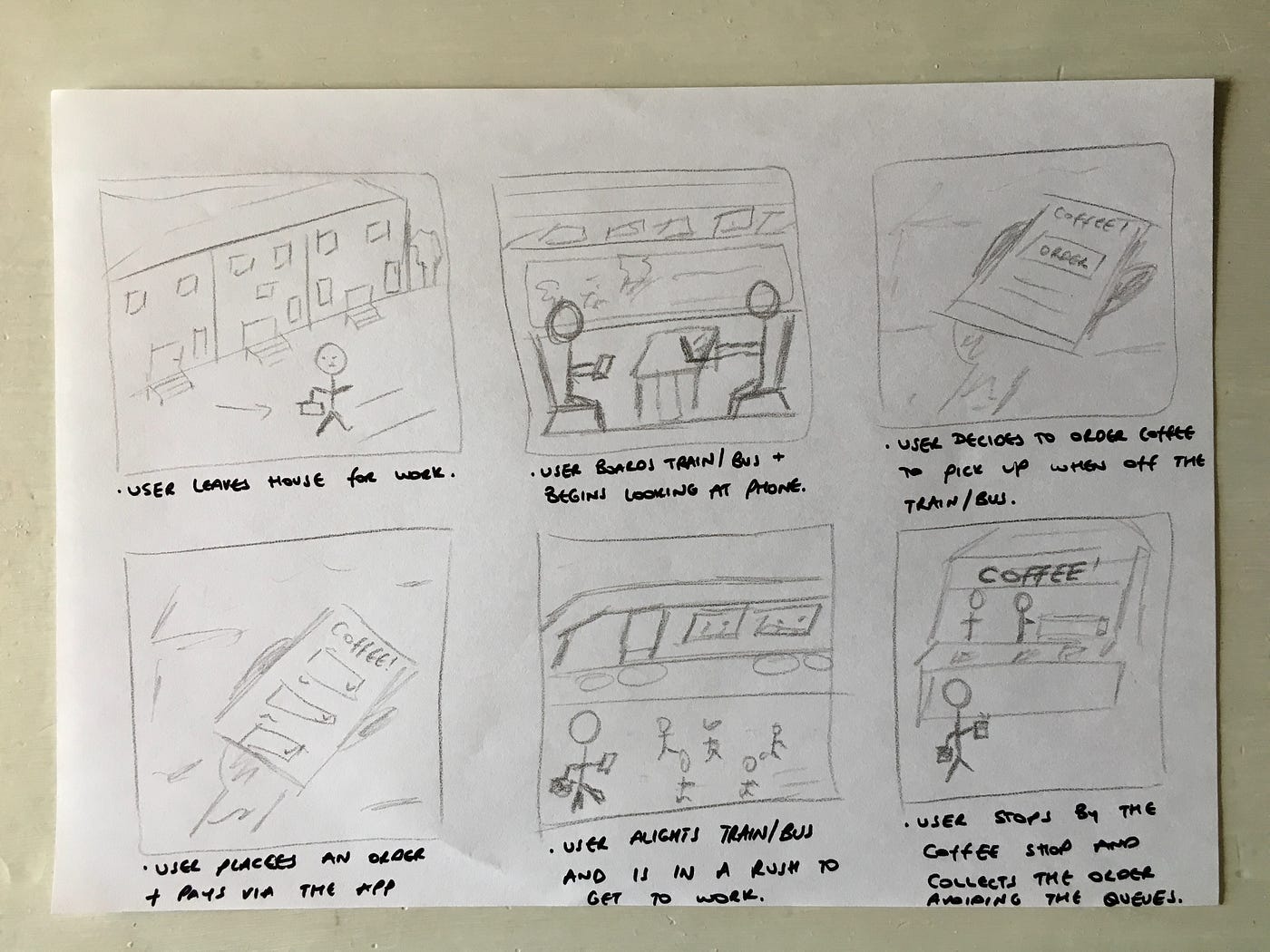 My next task is to storyboard, making sure that I focus on the users actions and environment. Here's the storyboard I came up with.