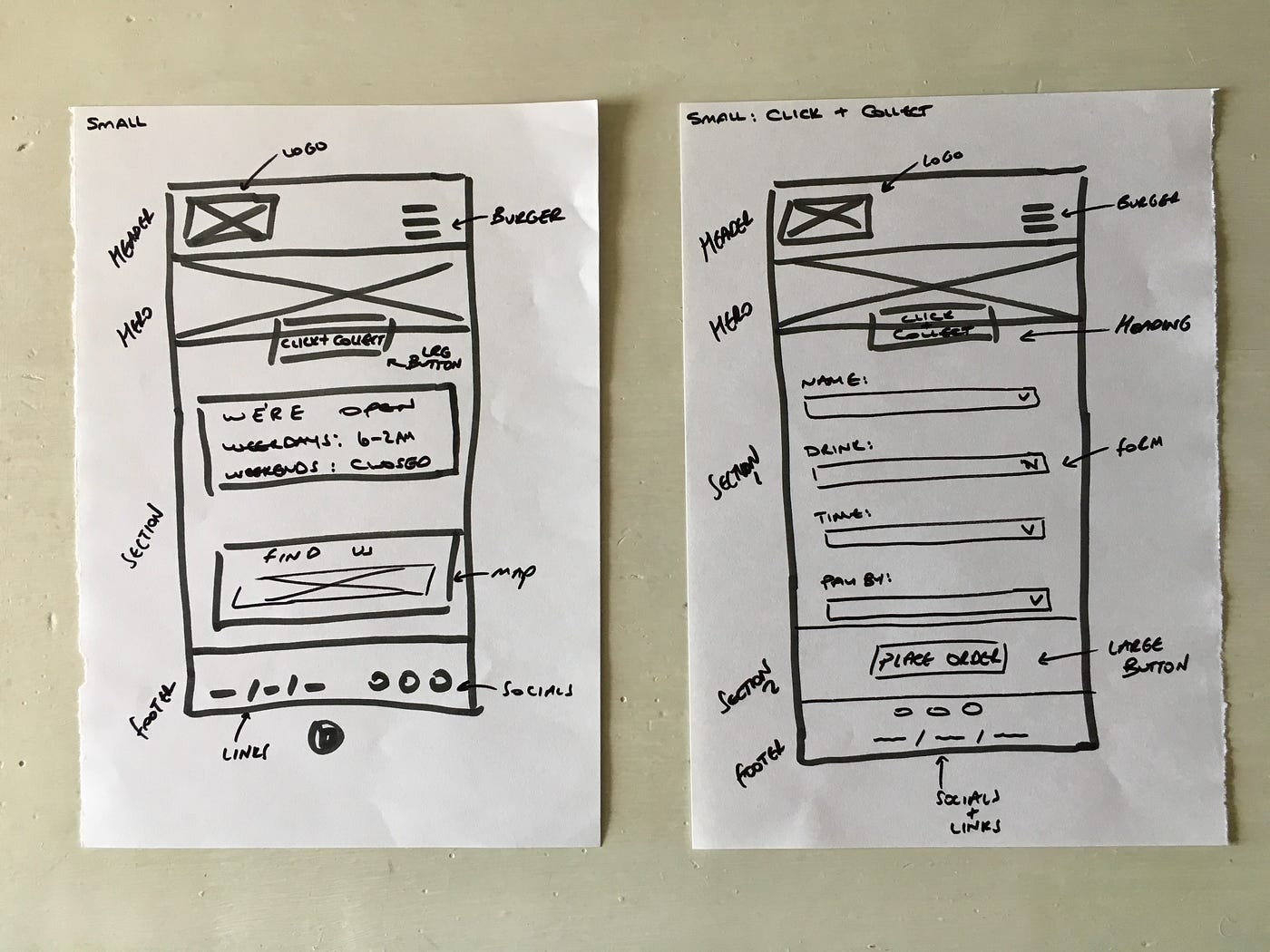 The final step was wireframing for small screens. Similar to the medium layout, the click and collect form fields for small screens are now stacked on top of each other to avoid it looking cramped. The elements on the landing page are also stacked on top of each other. Again a nice big click and collect button on the landing page so that the user can go to the ordering form with just one single click and the open hours are nice and clear to the user.